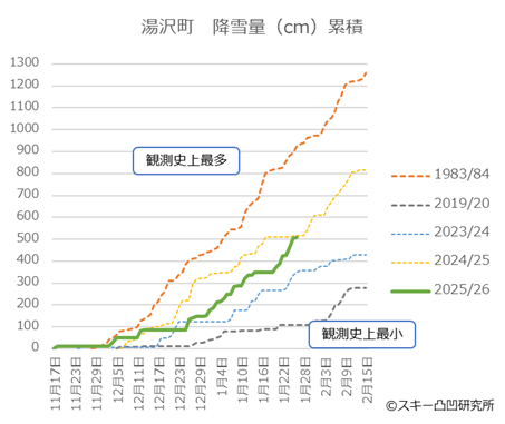 2026年1月26日時点の新潟県湯沢町のシーズン累積降雪量が、ほぼ昨シーズンと並びました。