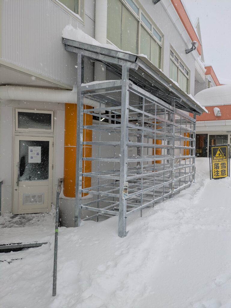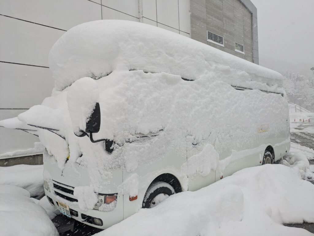 駐車場は消雪パイプがあるのでほとんど雪が積もっていませんが、もし消雪パイプが無ければマイクロバス全体が埋まっていたかもしれません。